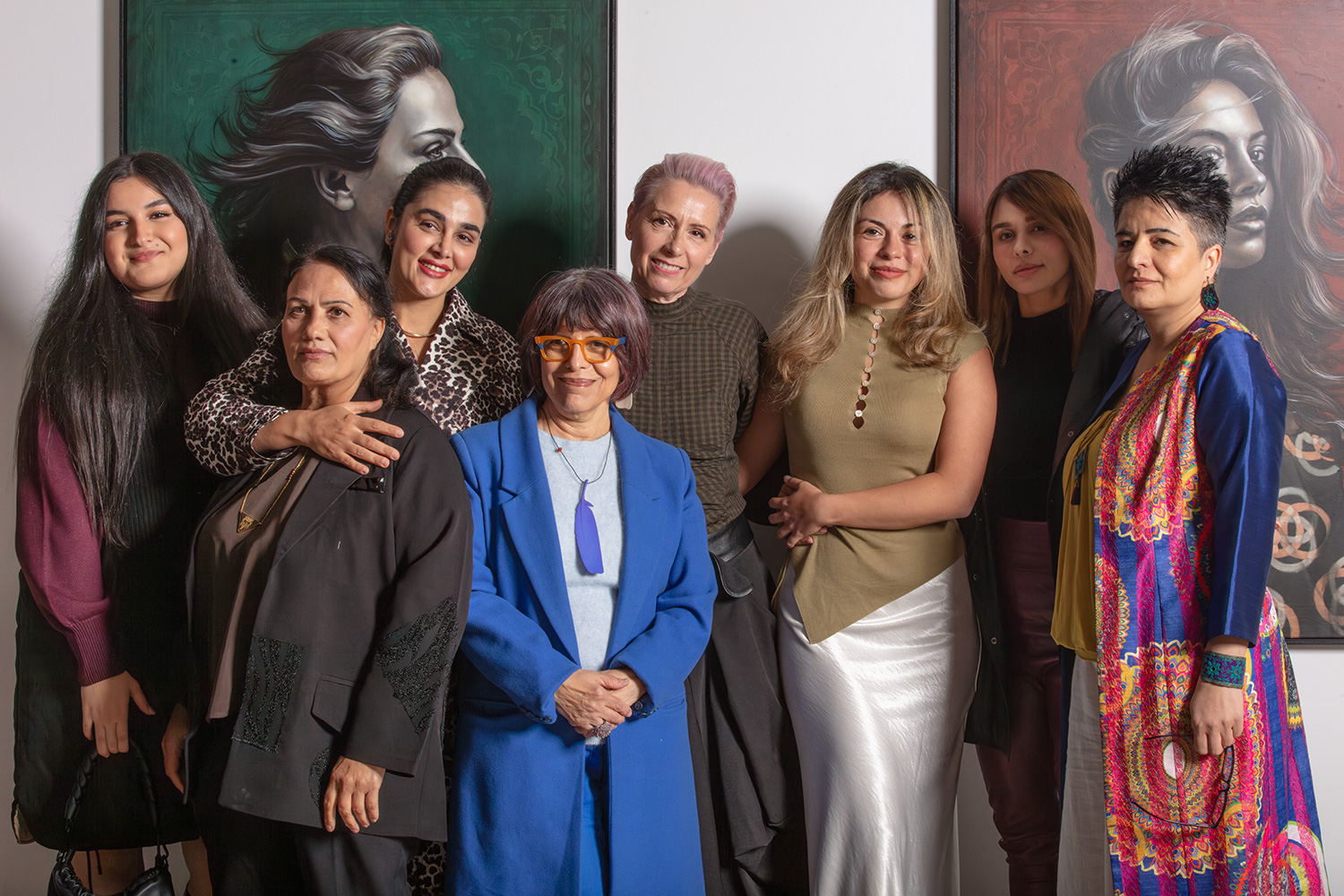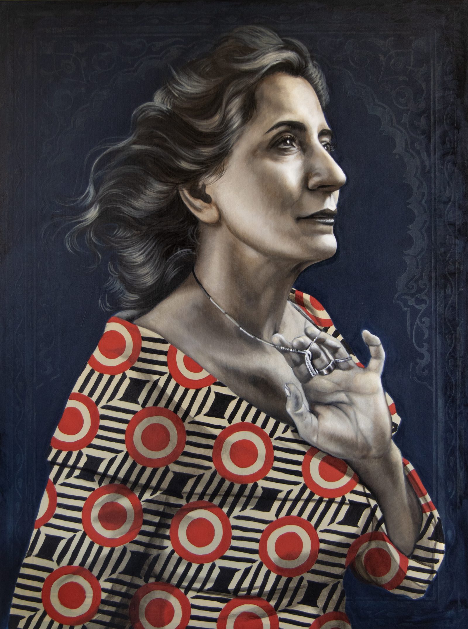 Collective Threads challenges a tradition in which the female form has historically served as muse rather than maker. In the canon of Western art, women have been confined to what Laura Mulvey describes as “to-be-looked-at-ness” (Mulvey, 1975), their function primarily ornamental, their value tethered to male genius–to the male gaze. Collective Threads tears through this legacy. In Longhurst’s paintings, the sitters meet the viewer’s gaze head-on. Stoic, burning, unflinching. The embossing patterns that frame each of the subjects reference Persian wedding invitations. Typically ornate, celebratory, and decorative, these designs become symbols of entrapment. Their visual beauty masks their purpose: to signify the binding of a woman into a life not always of her choosing. The homage to Russian Constructivist patterns, meanwhile, recall women like Liubov Popova and Varvara Stepanova, artists whose creative contributions were subsumed into the machinery of political propaganda. Despite their radical innovations, they became cogs in state-controlled collectives, their artistic legacies eclipsed by male counterparts. Longhurst weaves these histories into her portraits, refusing the erasure of women’s labour, both past and present.
